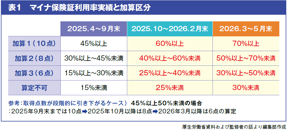 加算の点数に変更はありませんが、マイナ保険証利用率実 績の要件が「2025年10月~」と「2026年3月~」の2段階で引き上げられます(表1)。利用率実績によっては、点数が下がるケースがあるため、注意が必要です。