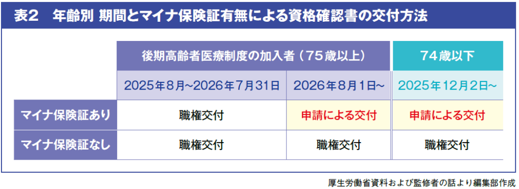 2025年12月2日以降、従来の健康保険証は廃止され、マイナ保険証の利用を基本とした仕組みへ移行します。有効期限内であれば、健康保険証の利用は可能ですが、それ以降はマイナ保険証か資格確認書のどちらかを提示することになります。資格確認書には、行政が自動的に交付する「職権交付」と、本人等の申請によって交付されるものがあります。75歳以上の後期高齢者については、2026年7月末までは職権交付によって資格確認書が送付されますが、8月以降は必要に応じて申請が必要です(表2)。