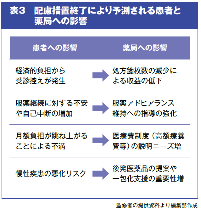 しかし、2025年10月1日以降は、該当する75歳以上の後期高齢者は窓口負担が従来よりも増え、最大で月6,000円程度の負担増加が生じる可能性があります。これにより、起こりうる患者さんへの影響を踏まえ、薬局として服薬支援や負担軽減につながる提案など、具体的な対策を検討する必要があるでしょう(表3)。