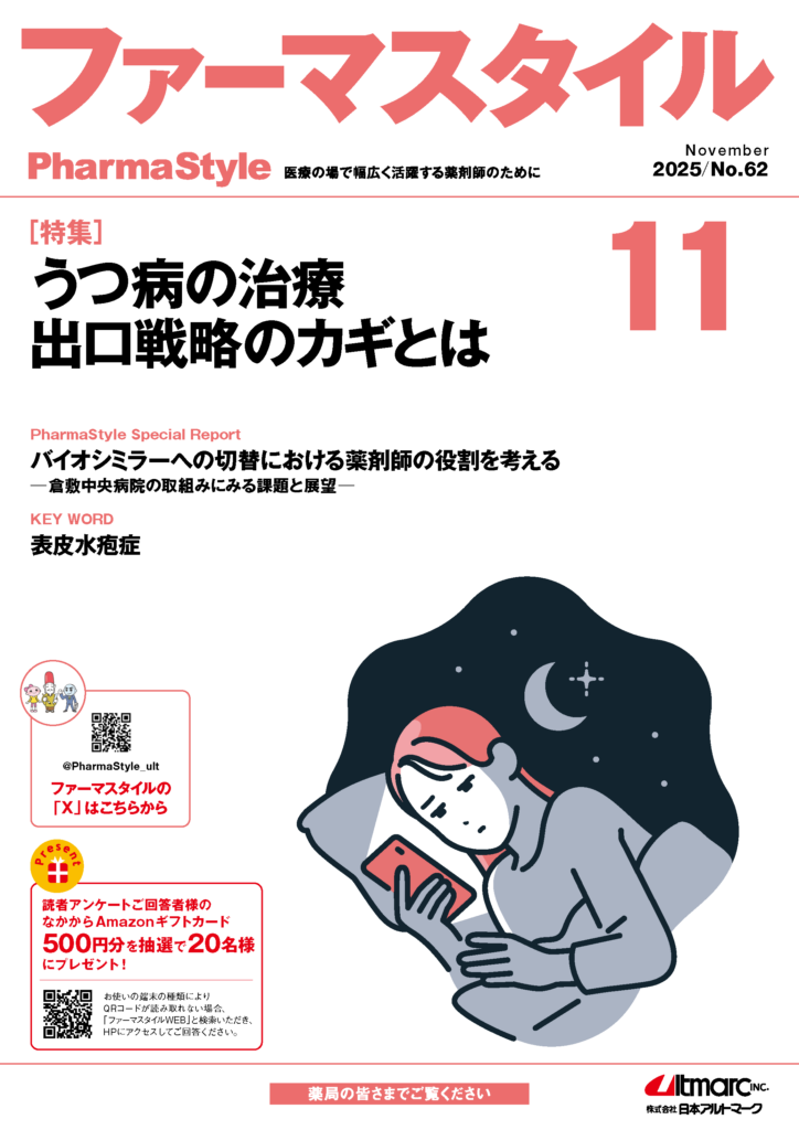 医療の場で幅広く活躍する薬剤師のために【ファーマスタイルWEB】は、株式会社日本アルトマークによって運営されています。当サイトに掲載してあります企業提供DI(ドラッグインフォメーション)は、本誌が発行された当時のものであり、現時点における最新情報ではない可能性があります。当サイトの企業提供DIをご利用の際は、必ず最新の添付情報をご確認ください。会員は、当サイトに掲載されている情報を自らの責任を持って利用するものとし、(株)日本アルトマークは、一切の責任を負いません。