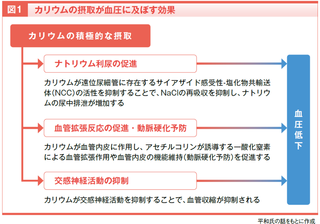カリウムの摂取は、ナトリウム利尿作用、血管拡張作用、交感神経活動の抑制などを介して血圧を低下させ(図1)、脳心血管イベントリスク低減にも寄与することが示されています9)。