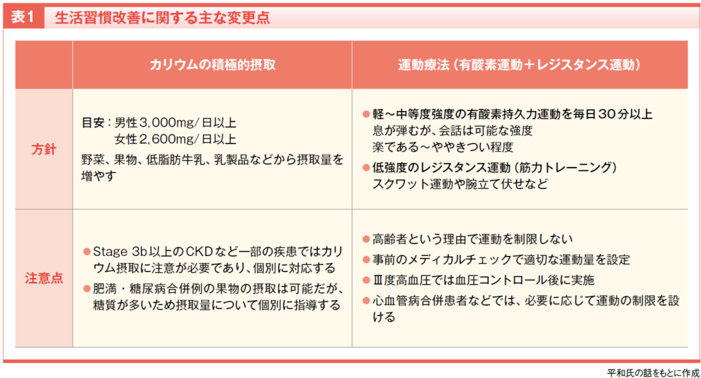 今回のガイドライン改訂では、近年のエビデンスを踏まえ、生活習慣改善に関していくつかの推奨が見直されました。その1つが、カリウムを多く含む食品の積極的な摂取であり、従来よりも強調された内容になっています。