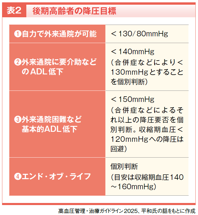 特に75歳以上では、健康・機能状態が降圧療法のリスク・ベネフィットに及ぼす影響を鑑みて、降圧目標が4つに分類されます。自力で外来通院が可能なADLが保たれた患者の降圧目標は130/80mmHg未満ですが、ADLが低下している患者ではその限りではありません(表2)。カテゴリー2と3では、収縮期血圧<120mmHgで降圧薬の減量を考慮することが示されているのです。後期高齢者における降圧目標の違いは今回のガイドラインのポイントのひとつとして把握しておくと良いでしょう。