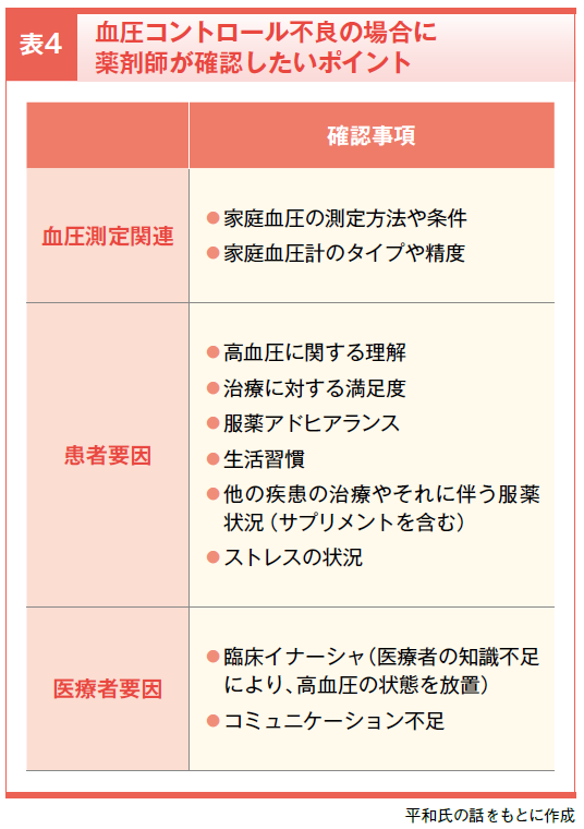 こうしたエビデンスを受けて、今回のガイドラインの改訂では新たにClinical Questionとして「高血圧のチーム医療は高血圧患者の血圧管理を向上させるか?(CQ15)」が盛り込まれ、血圧管理を目的としたチーム医療の実践が強く推奨されました。生活習慣改善や服薬継続の支援は、患者の背景や価値観を踏まえた個別的なアプローチが不可欠ですが、診察時間の限られる医療現場では、医師だけで十分な介入を行うことが難しいケースも多くあります。そのなかで、継続的に患者さんとかかわる薬剤師は、血圧管理においてきわめて重要な役割を担います。薬局での対話を通じて、治療の障壁や問題点を早期に把握し、適切な情報提供、生活習慣への助言、配合剤への切替えなどアドヒアランスの支援を行うことは、血圧管理の継続や質の向上に欠かせないものです。高血圧治療を行っているにもかかわらず、血圧コントロールが不十分な状態が続く場合には表4の項目を見直し、対応を検討することが望まれます。