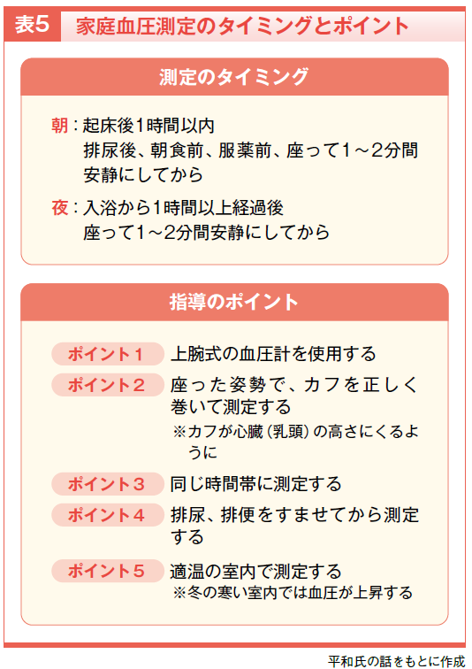 家庭血圧の活用に向けては、正しい測定の方法と測定条件(表5)を守り、信頼できるデータに基づいて評価しなくてはなりません。特に冬季は、朝、暖房をつける前の寒い室内で測定している患者さんも散見され、実際よりも血圧が高値を示しているケースも少なくありません。血圧管理は長期に及ぶため、時間が経つと指導内容を忘れてしまったり、手技が自己流になってしまったりすることもあります。正確な評価のためには、必要に応じて医師からの指導内容や家庭血圧測定の手技などを再確認すると良いでしょう。
