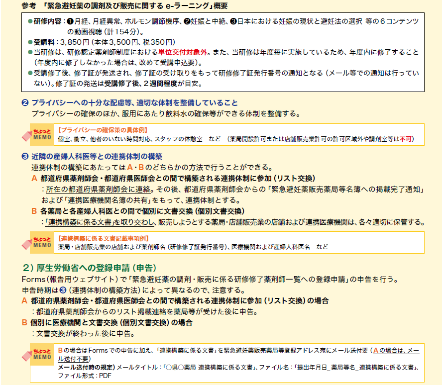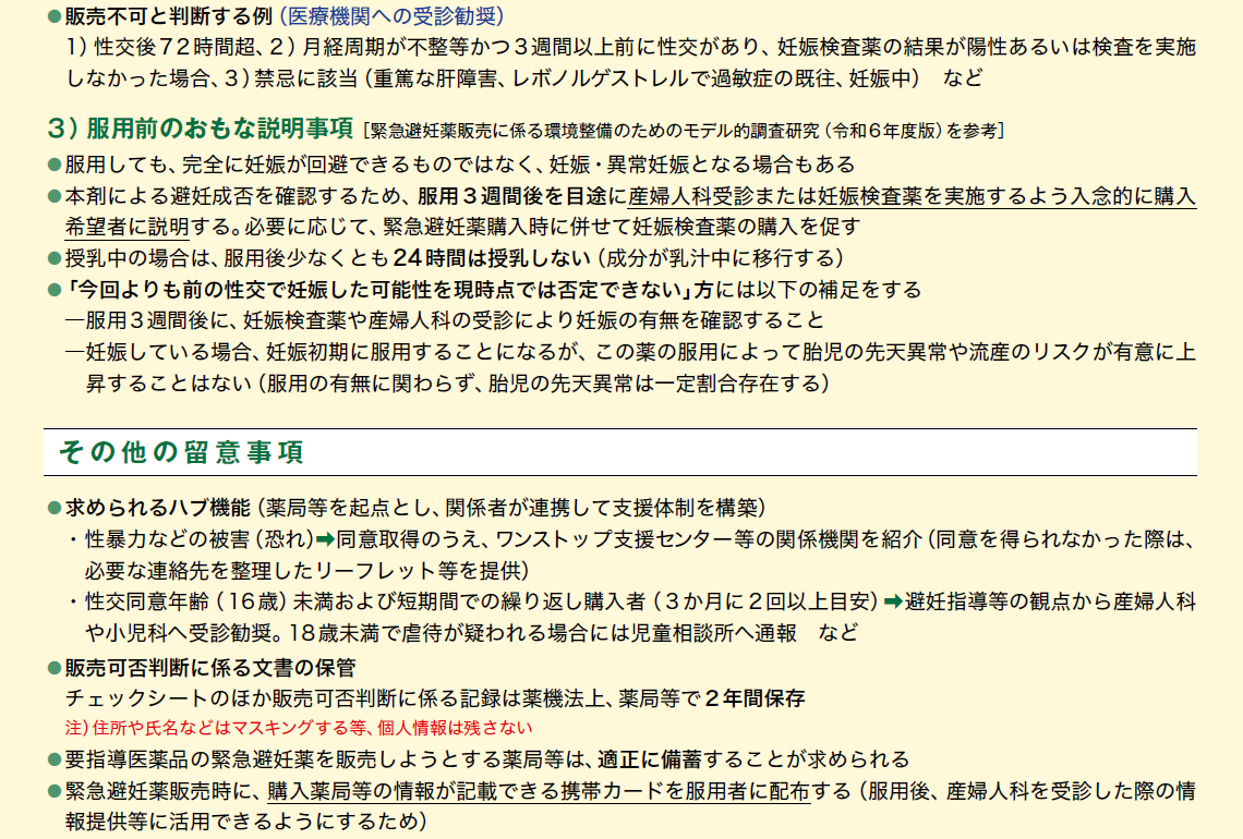 緊急避妊薬は、2025年8月に開催された第2回薬事審議会要指導・一般用医薬品部会にて、要指導医薬品としての製造販売承認が了承された。これを受け、本剤を販売する薬局・薬剤師には、指定研修の修了、プライバシーへの配慮等の体制整備、近隣の産婦人科医との連携体制構築といった販売にあたっての各種要件が示された。