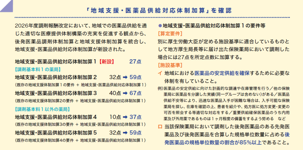 2026年度調剤報酬改定では、「後発医薬品調剤体制加算」は廃止され、「地域支援・医薬品供給対応体制加算」へと統合されました。評価の焦点は、後発医薬品の使用割合のみならず、「欠品させない体制」「地域内での分譲対応」など安定供給への取り組みに広がり、地域医療を支える供給体制の整備そのものが評価対象となる局面に入っているといえます。