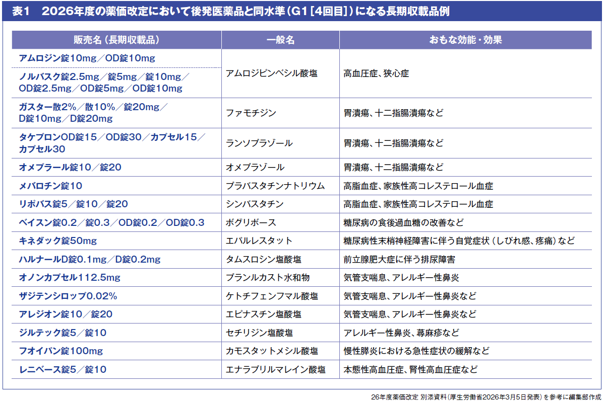 表1は、2026年度の薬価改定により、後発医薬品と同水準(後発医薬品価格の加重平均値の1.0倍)に到達する見込みのおもな長期収載品です。降圧薬、消化性潰瘍治療薬、脂質異常症治療薬など、薬局で日常的に取り扱われる医薬品も含まれ、その薬価水準の変化は実務運用にも影響する可能性があります。