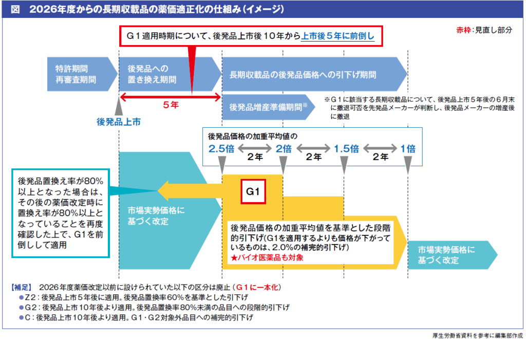 また、従来は後発医薬品の置換率などに応じてG1以外にG2、Zなど複数の区分が設けられていましたが、G1ルールを軸とする体系へ再編されます(図)。制度構造がシンプルになる一方で、後発医薬品収載後、長期収載品の価格調整は従来よりも早期に進んでいくことになります。
