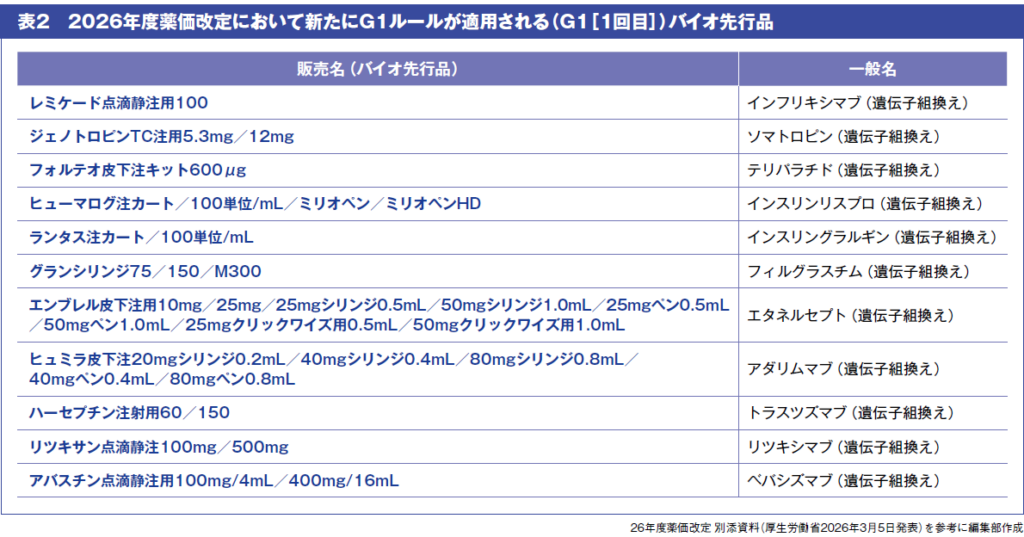 さらに、バイオシミラーが収載されているバイオ先行品についてもG1ルールが適用されることとなりました。これまでは、バイオAGが収載された場合に限り適用されていましたが、バイオシミラーへの置換えが一定程度進展している状況を踏まえ、適用が拡大されました(表2)。