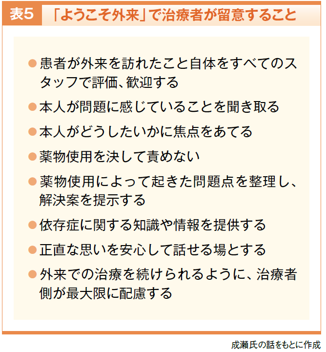 たとえ親から言われて渋々であっても、「このままじゃいけない」と思うから外来に来てくれているのですから、これまで生きてきてくれたことと、外来に来てくれたこと自体を、外来スタッフみんなで「本当によく来てくれたね」とかかわるのが「ようこそ外来」なのです(表5)。
